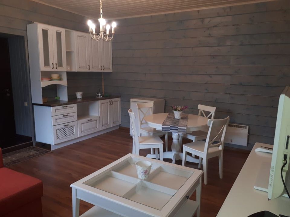 С гарнитуром, оборудована микроволновой печью, чайником, обеденным столом и холодильником. Кофе и чай.