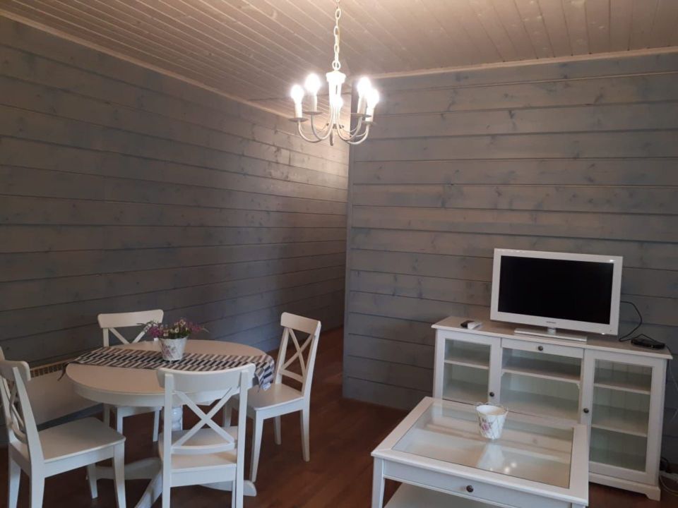 Зона отдыха, оборудована столом, стульями, диваном и телевизором.